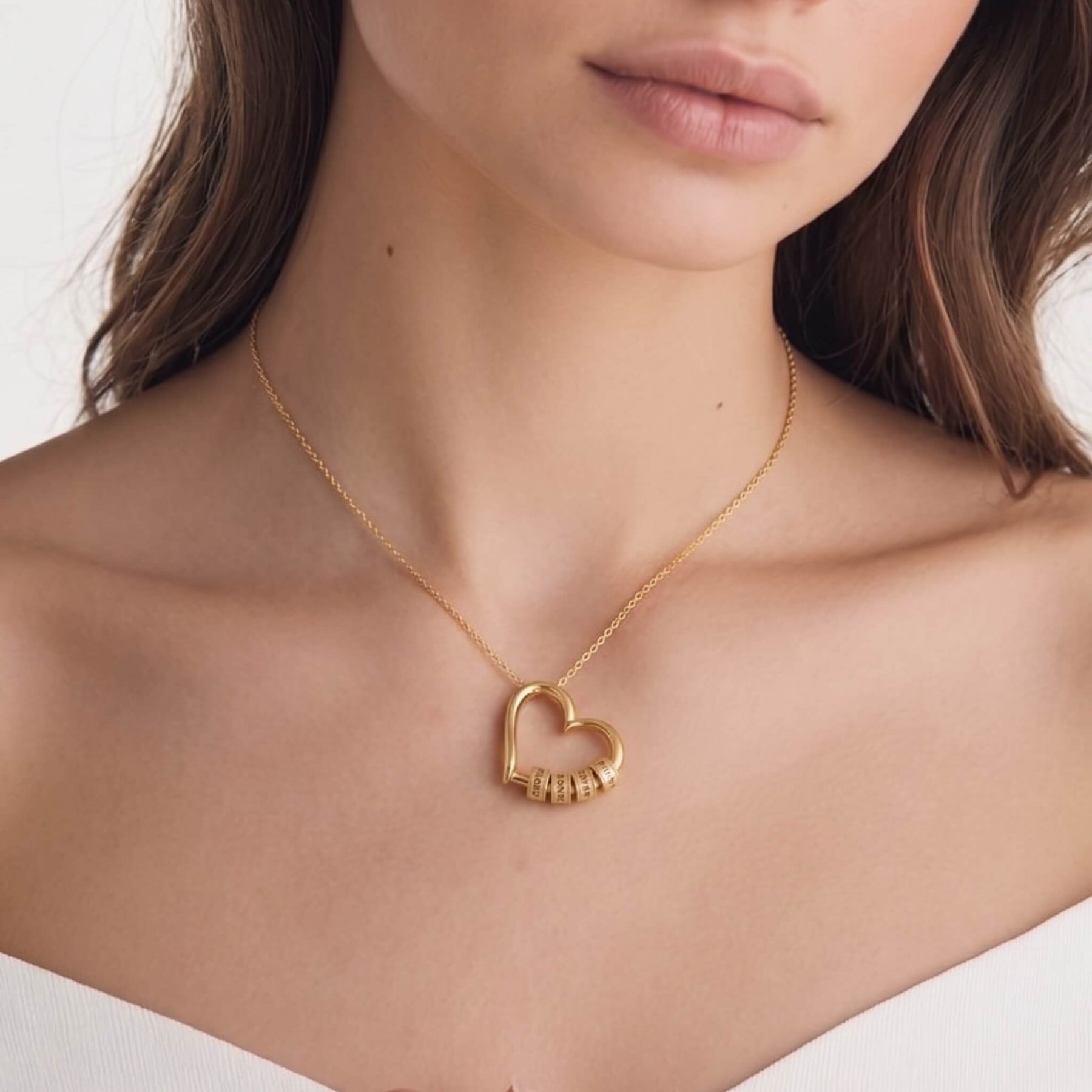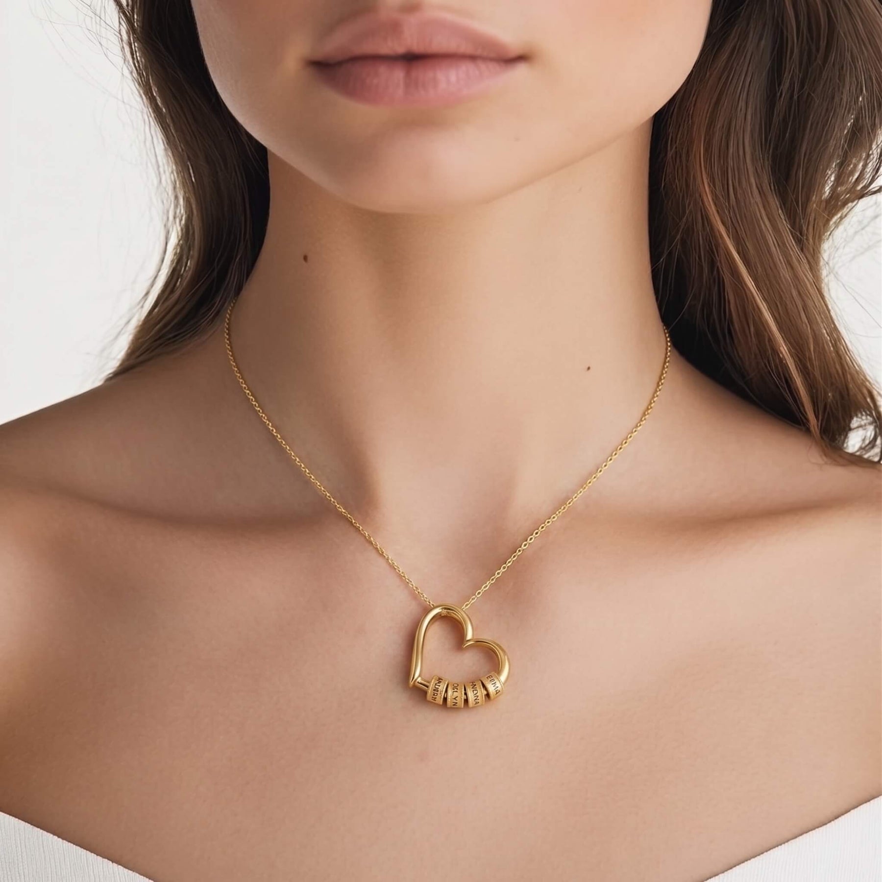 Along the arc of the heart sit small engraved charms, one for each name that means something. They rest close together and remind you every day that you are never alone – that they are always with you, close to the heart.